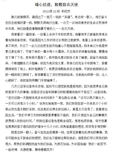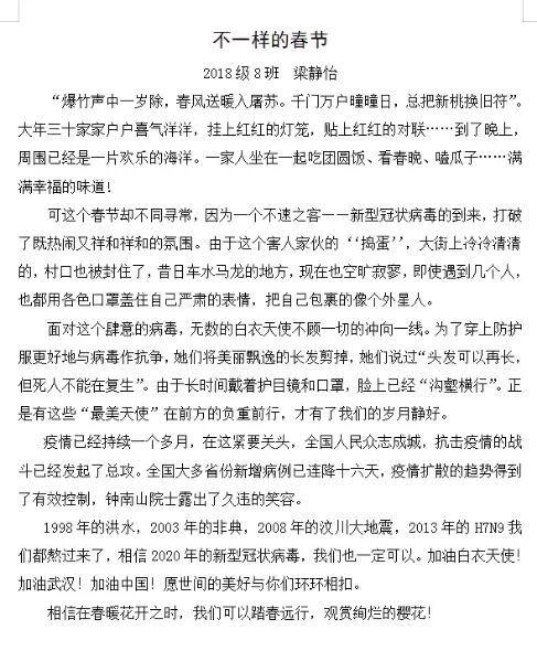 “爸爸,怎么才是爱国家?”“白衣天使们奔赴一线,是爱国,爸爸妈妈好好上班,也是爱国。”“那我呢,今天我在电脑上听老师讲课了。”“你也很棒!”一对父子的对话让我触目,作为一名中学生,现在自己能做的就是在线上好好学习,不管是多么难做的题,多么难背的课文,我相信我们都会像那些逆行者们一样,战胜困难。